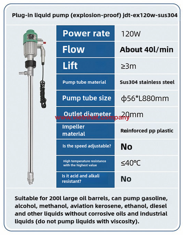 Tốc độ dòng chảy ổn định của Bơm chất lỏng cắm điện chống cháy nổ JDT-EX120W-SUS304 khi hoạt động là một trong những yếu tố then chốt quyết định hiệu suất và độ an toàn trong quá trình bơm hút chất lỏng. Với thiết kế chuyên dụng và công suất phù hợp, thiết bị này mang lại khả năng vận hành mượt mà, liên tục và đáng tin cậy trong nhiều môi trường công nghiệp khác nhau.