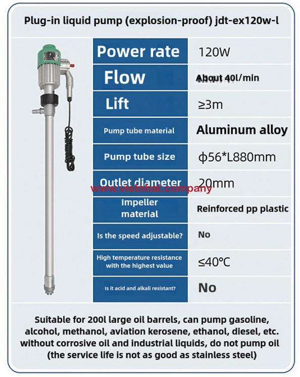 Máy bơm chất lỏng cắm trực tiếp chống cháy nổ JDT-EX120W-L là thiết bị chuyên dụng trong việc sang chiết các loại nhiên liệu dễ bay hơi như xăng, cồn, methanol hay diesel. Với thiết kế tối giản nhưng hiệu quả, sản phẩm mang đến nhiều ưu điểm nổi bật, đáp ứng tốt nhu cầu sử dụng trong môi trường yêu cầu độ an toàn cao.