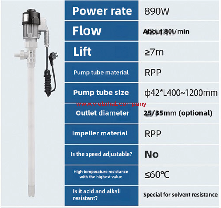 Ống bơm là điểm khác biệt lớn trong cấu tạo của Máy bơm chất lỏng cắm trực tiếp chống cháy nổ JDT-EX890W-RPP. Vật liệu RPP có khả năng chống ăn mòn hóa học tốt, phù hợp với nhiều loại dung môi và axit nhẹ. Ngoài ra, trọng lượng nhẹ giúp việc di chuyển và lắp đặt trở nên dễ dàng hơn mà không làm giảm độ bền cơ học.