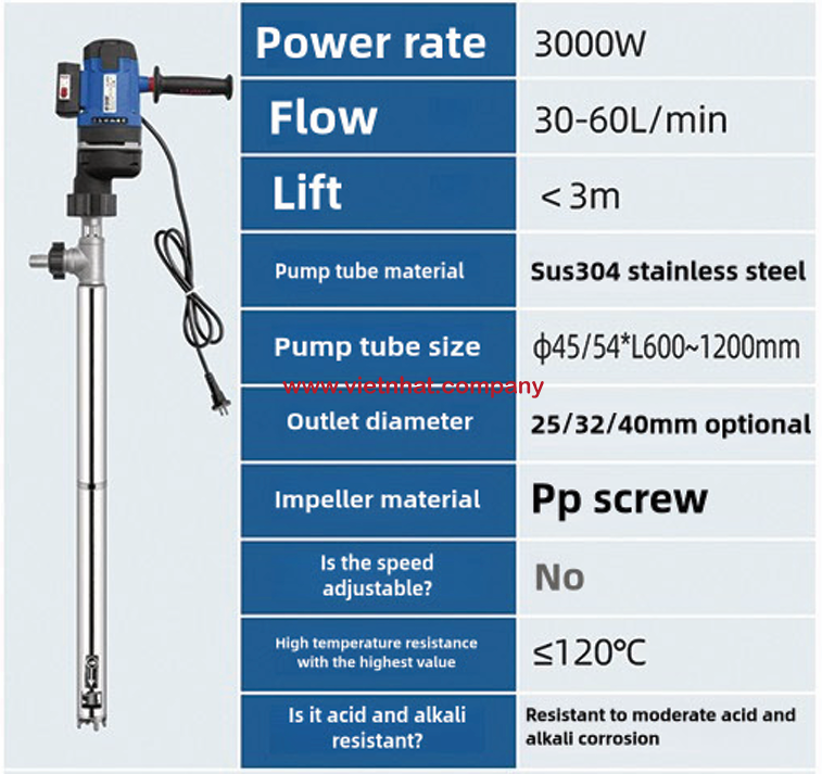 Máy bơm điện chất lỏng JDT-3000W-LGG120 là thiết bị chuyên dùng để bơm và chiết rót các loại chất lỏng có độ nhớt cao từ thùng phuy hoặc thùng chứa công nghiệp. Nhờ thiết kế ống bơm bằng thép không gỉ SUS304 kết hợp với cánh bơm dạng trục vít bằng nhựa PP, thiết bị có thể vận hành ổn định với nhiều loại chất lỏng đặc như dầu bánh răng, mỡ bôi trơn, siro hay nhựa resin.