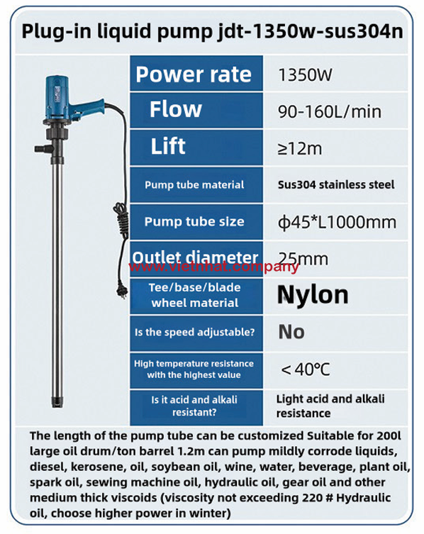 Máy bơm hút thùng phuy cắm điện JDT-1350W-SUS304N đang là sản phẩm được nhiều doanh nghiệp lựa chọn để vận chuyển chất lỏng trong các ứng dụng công nghiệp. Với thiết kế tiện dụng và hiệu suất hoạt động mạnh mẽ, sản phẩm này không chỉ đáp ứng được nhu cầu công việc mà còn tiết kiệm thời gian, công sức cho người sử dụng. Dưới đây là những lý do vì sao Máy bơm hút thùng phuy cắm điện JDT-1350W-SUS304N là sự lựa chọn hàng đầu cho doanh nghiệp.
