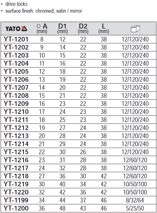 Ngoài model YT-1201, Đầu tuýp lục giác loại ngắn Yato còn nhiều model với kích cỡ khác nhau. (xem bảng thông số bên dưới)