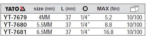 Ngoài model YT-7679, đầu tuýp mũi vít 2 cạnh Yato còn một số model khác trong bảng dưới đây: