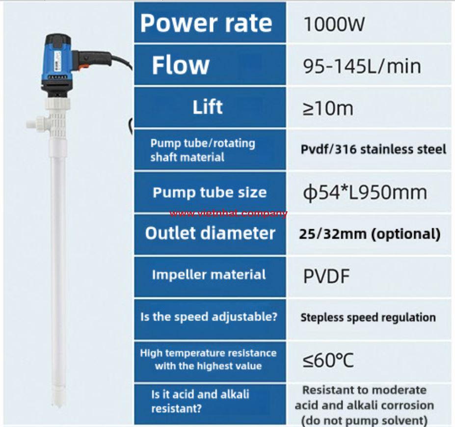 Thiết kế cầm tay tiện lợi của bơm cắm điện thùng phuy JDT-1000W-PVDF đáp ứng đúng yêu cầu thực tiễn: dễ cầm, nhẹ, thao tác nhanh, điều khiển bằng một tay và phù hợp với nhiều môi trường làm việc khác nhau. Đây là giải pháp lý tưởng cho những ai cần một thiết bị bơm hóa chất linh hoạt, đáng tin cậy và dễ sử dụng.