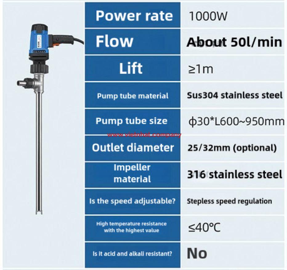 Bơm dầu thùng phuy chạy điện JDT-1000W-30SUS304 là thiết bị chuyên dụng được thiết kế nhằm phục vụ nhu cầu bơm và chiết rót dầu từ thùng phuy một cách nhanh chóng, an toàn và hiệu quả. Sản phẩm nổi bật nhờ sự kết hợp giữa động cơ công suất lớn, vật liệu cao cấp và thiết kế tối ưu cho môi trường công nghiệp.