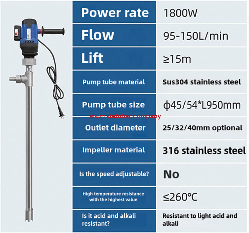 Nhờ thiết kế trục dài và đầu hút đặt thấp, bơm có thể hút triệt để chất lỏng nóng mà không cần nghiêng thùng, đảm bảo an toàn khi xử lý chất lỏng ở nhiệt độ cao.