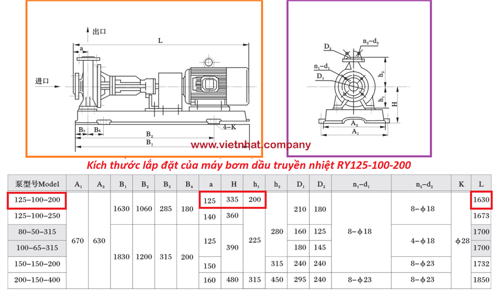 Kích Thước Lắp Đặt Của Bơm Dầu Truyền Nhiệt RY125-100-200