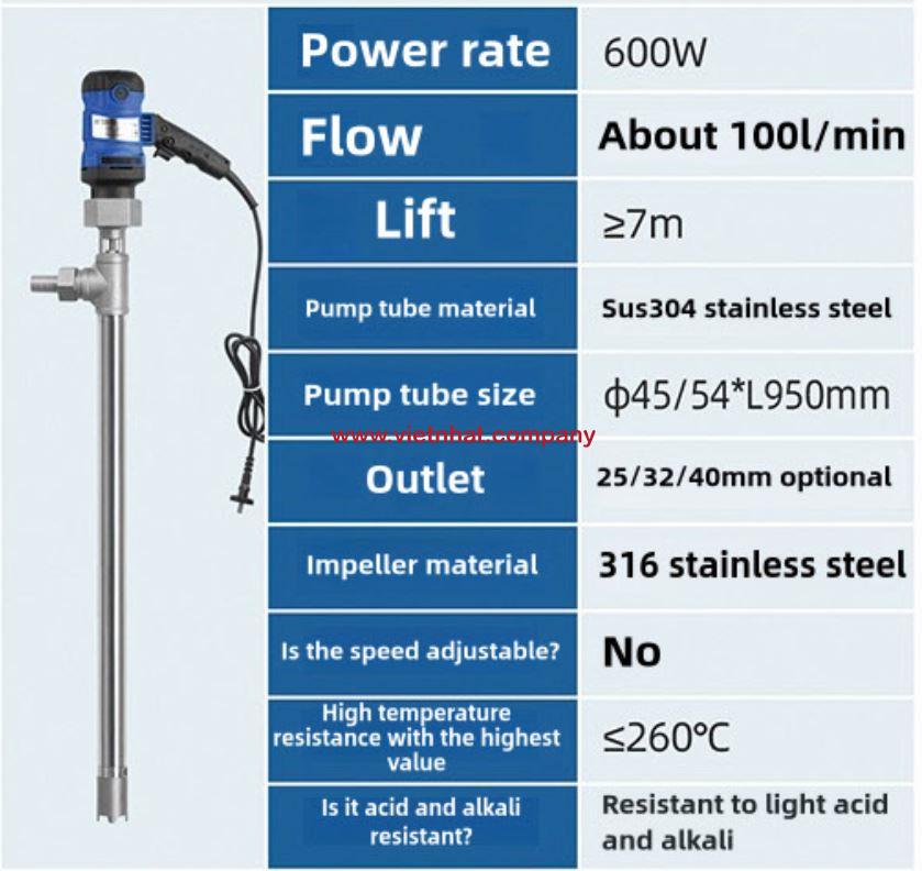 Với công suất 600W, thiết bị mang đến khả năng bơm mạnh mẽ, xử lý được nhiều loại chất lỏng kể cả những loại có độ nhớt trung bình. Bên cạnh đó, bơm được tối ưu hóa để tiết kiệm điện năng, giảm chi phí vận hành mà vẫn đảm bảo lưu lượng bơm ổn định và chính xác.