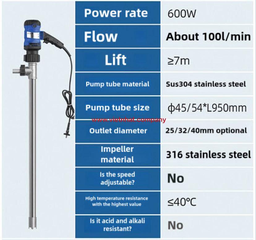 Bơm thùng phuy điện JDT-600W-304SUS là thiết bị nổi bật nhờ khả năng đảm bảo độ an toàn cao, đáp ứng tốt nhu cầu bơm các loại dung môi và hóa chất trong môi trường công nghiệp.