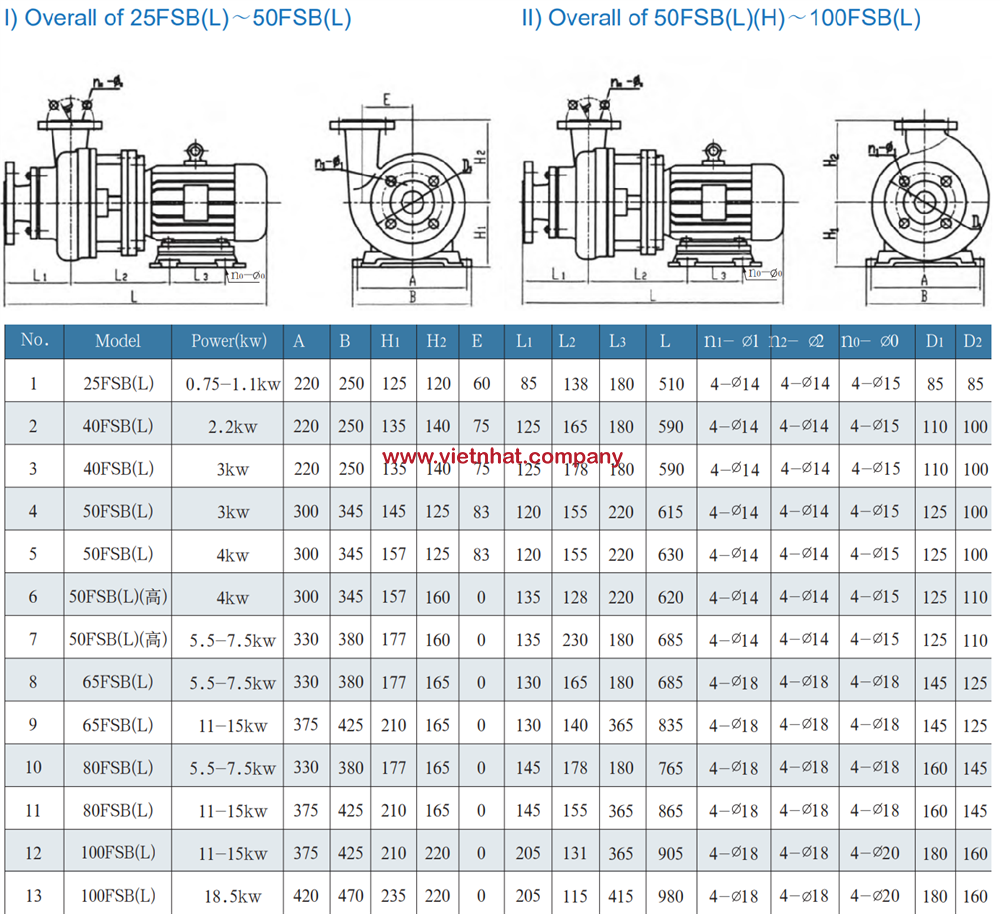 Thông số kỹ thuật của máy bơm hóa chất 50FSB-5.5