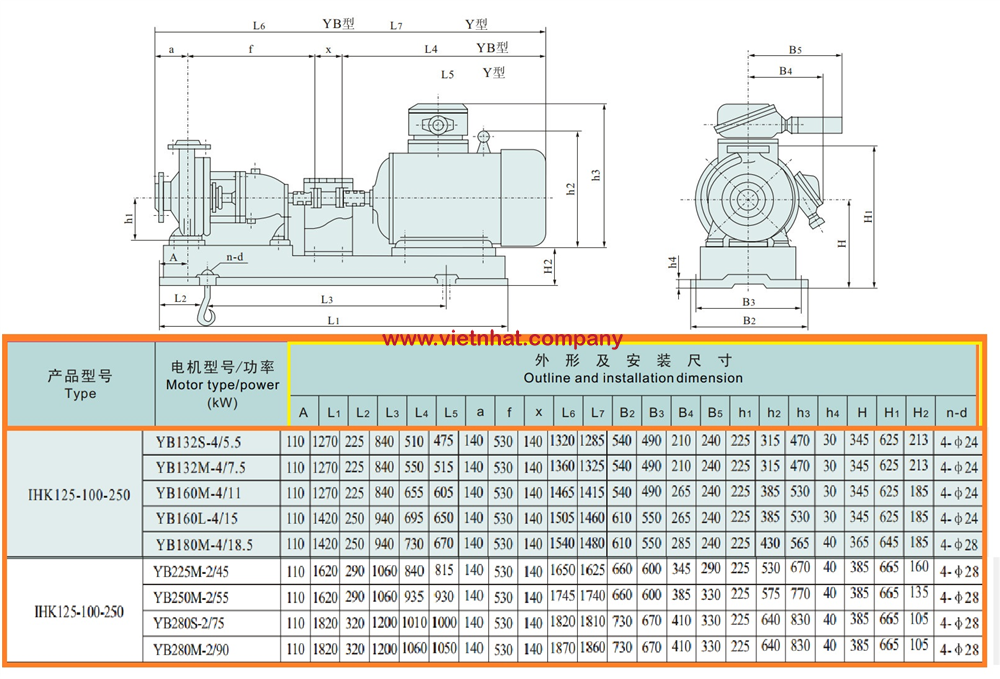 Kích thước của đầu máy bơm nước li tâm trục ngang cánh hở IHK125-100-250