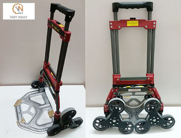 - Xe có tới 6 bánh, mỗi bên 3 bánh giúp vận chuyển hàng hóa nặng lên cầu thang ngoạn mục, đảm bảo an toàn.