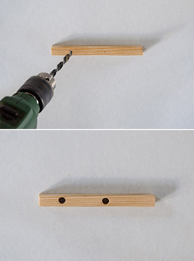 - Dùng máy khoan khoan lỗ tròn nhỏ đã làm dấu trên tấm gỗ và 2 thanh gỗ. Bạn khoan 2 lỗ tròn ở một đầu của mỗi thanh gỗ để gắn ốc vít nữa nhé!